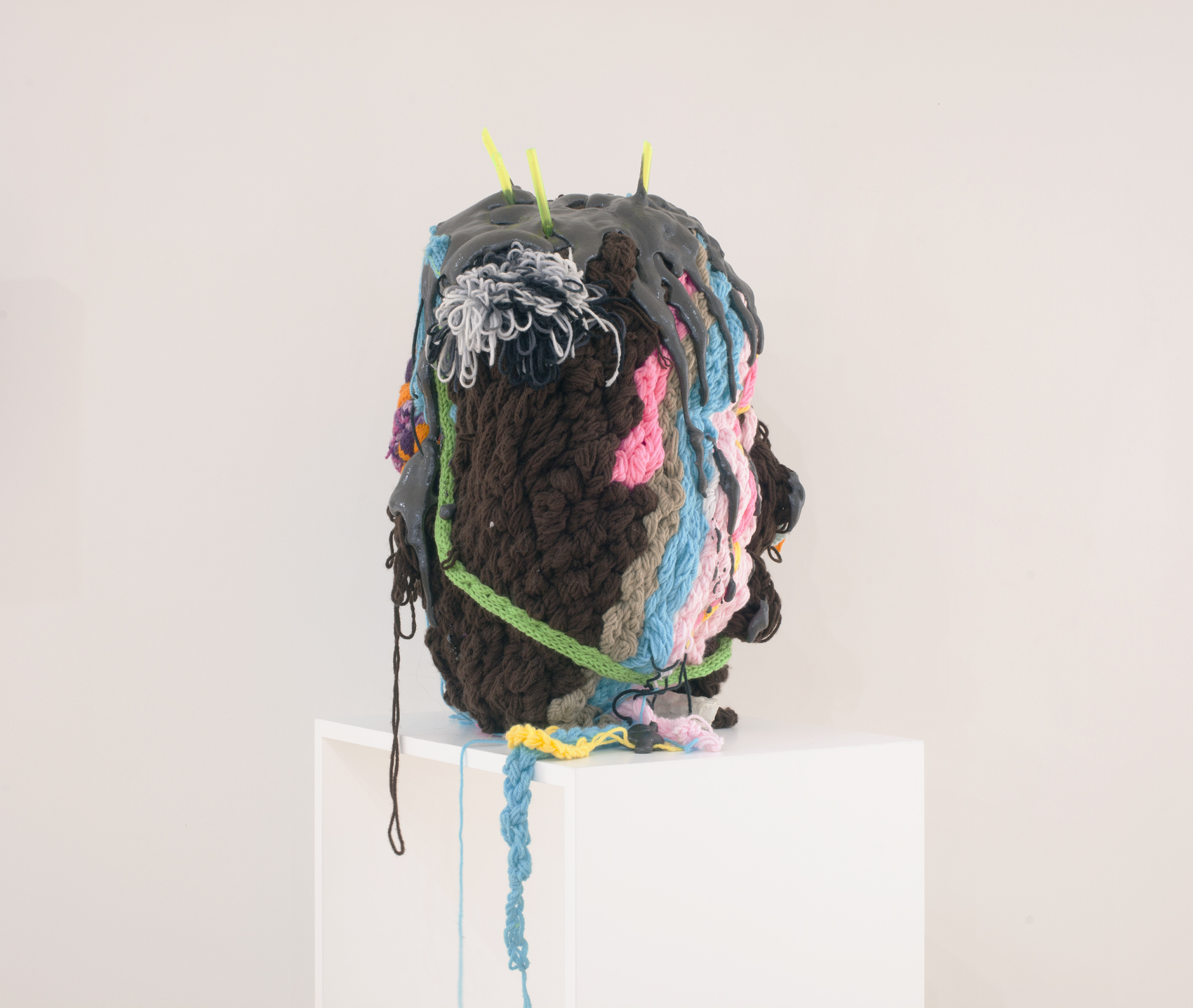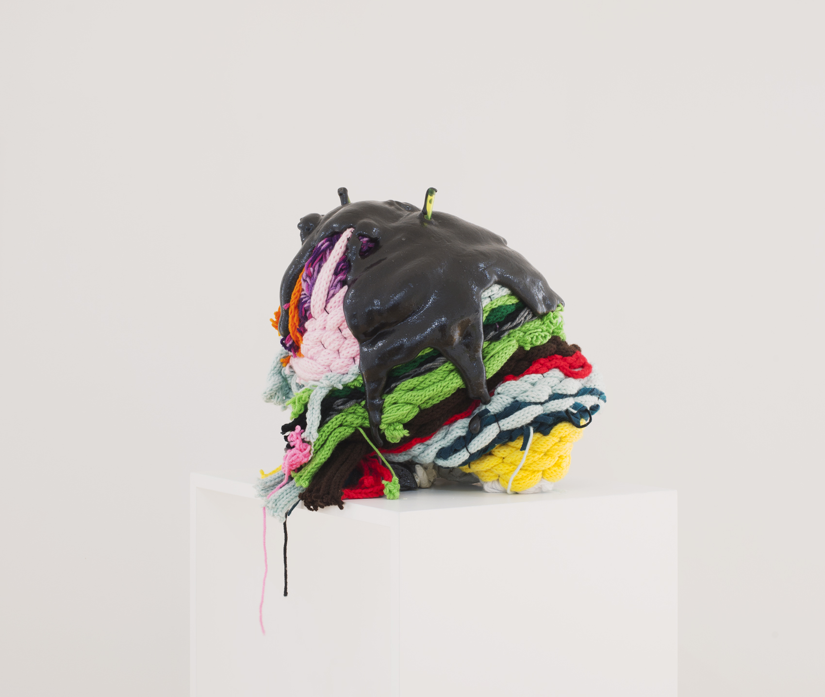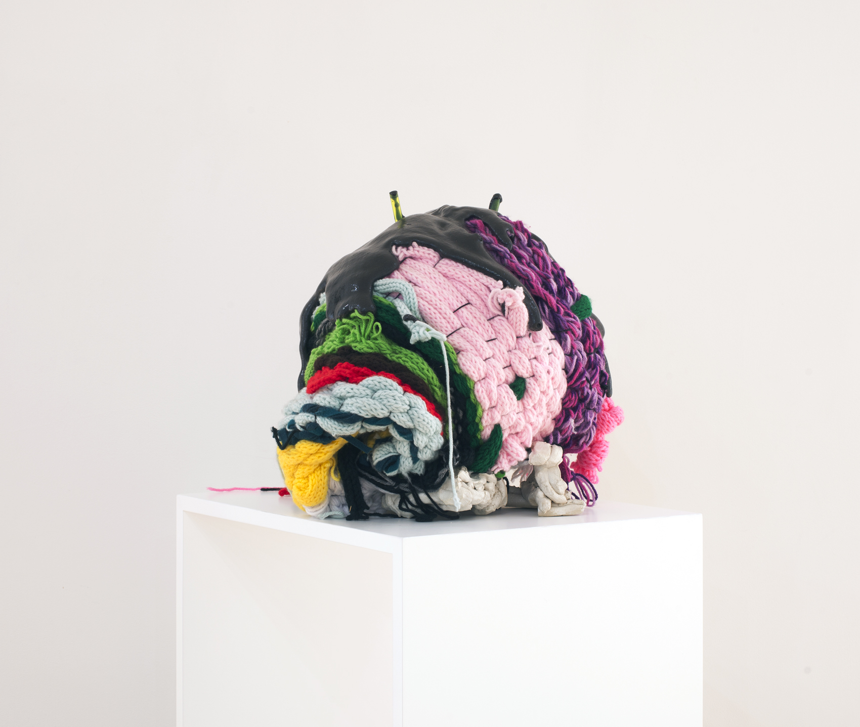 Michael Andrews uses tapestry, knitting and weaving techniques directly in compiling textiles or in the application of their structure in different mediums to in his mixed format works. According to the artist, textile is the halfway point between solid and liquid, in its physical flexibility and elasticity. ‘Sure Lick’ is an aggregation of mixed materials with such variability including thread, felt, and urethane, and the weave structure discovered here also appears in the video animation ‘Weird War’. Flat digital image is distorted partially to twist its space, and certain sections weaved in circulating tube.