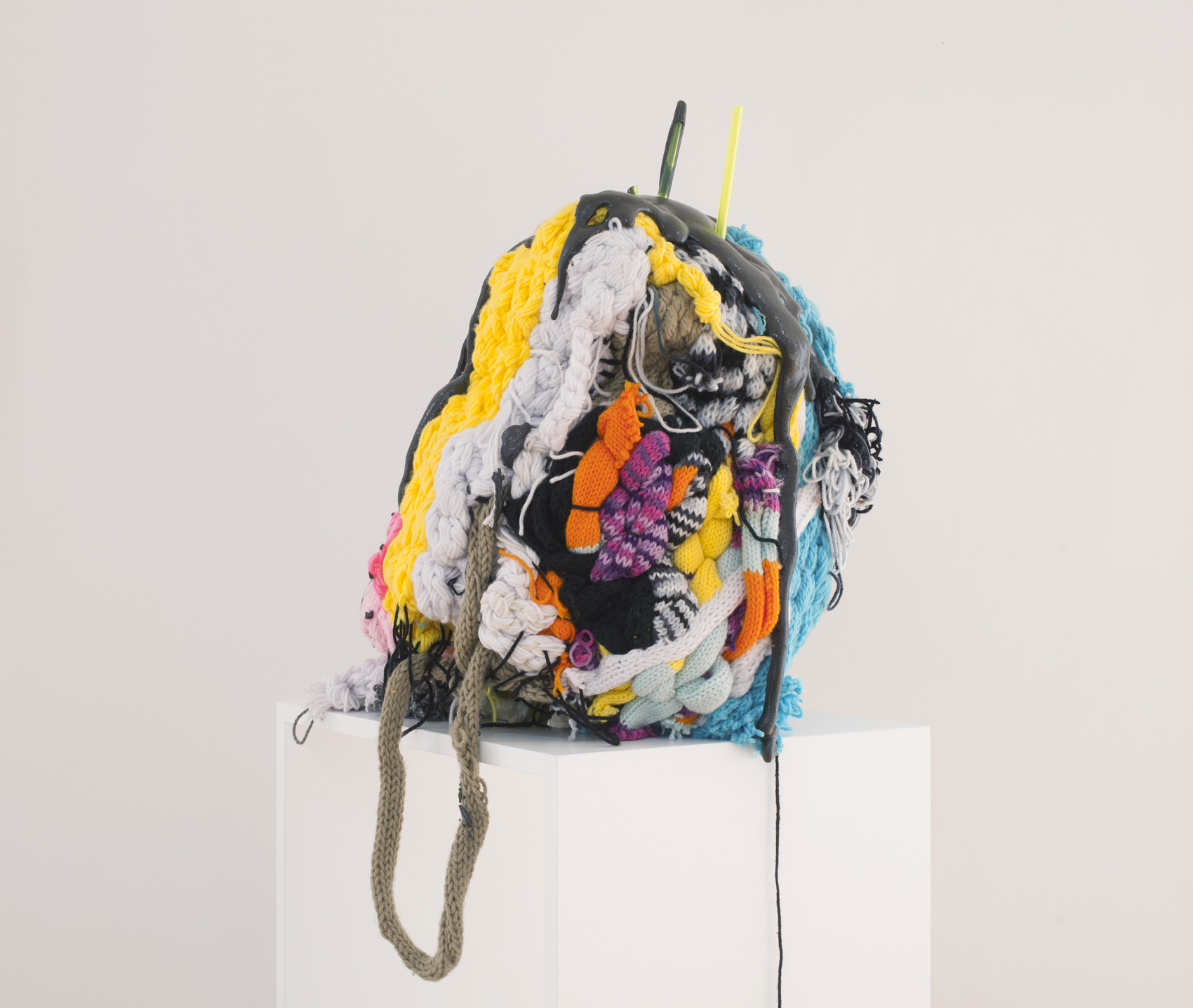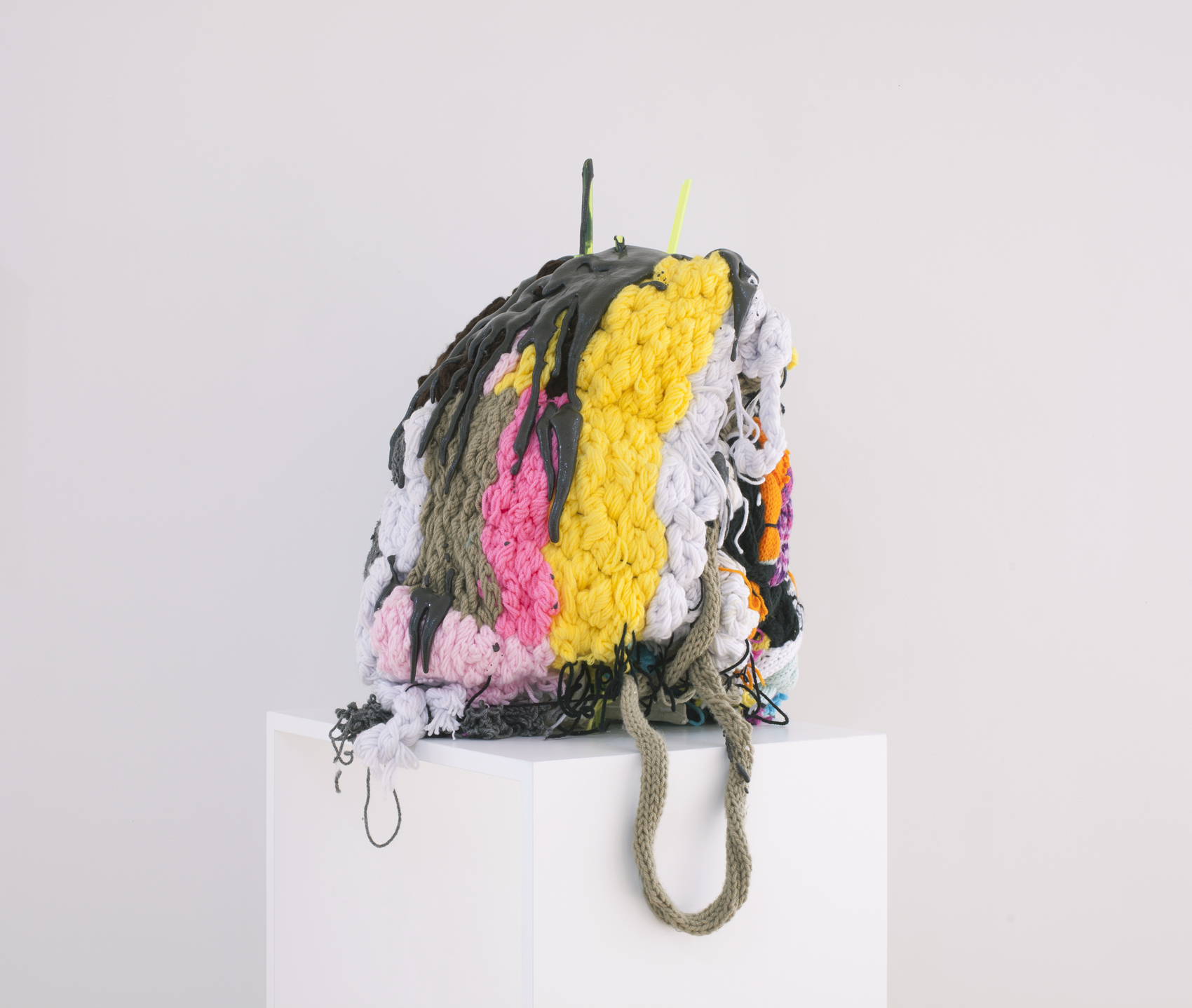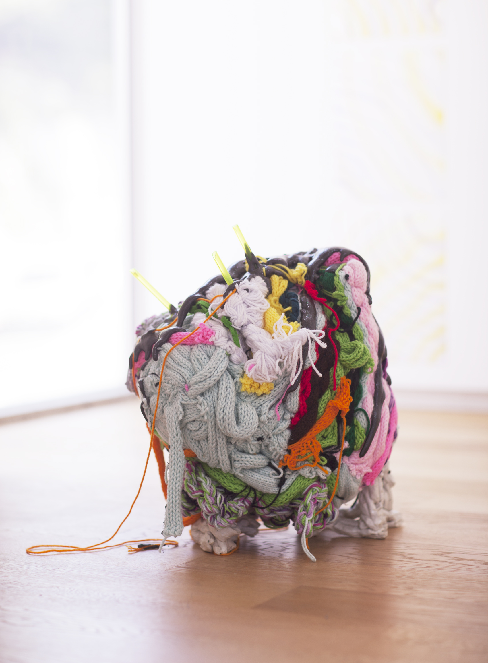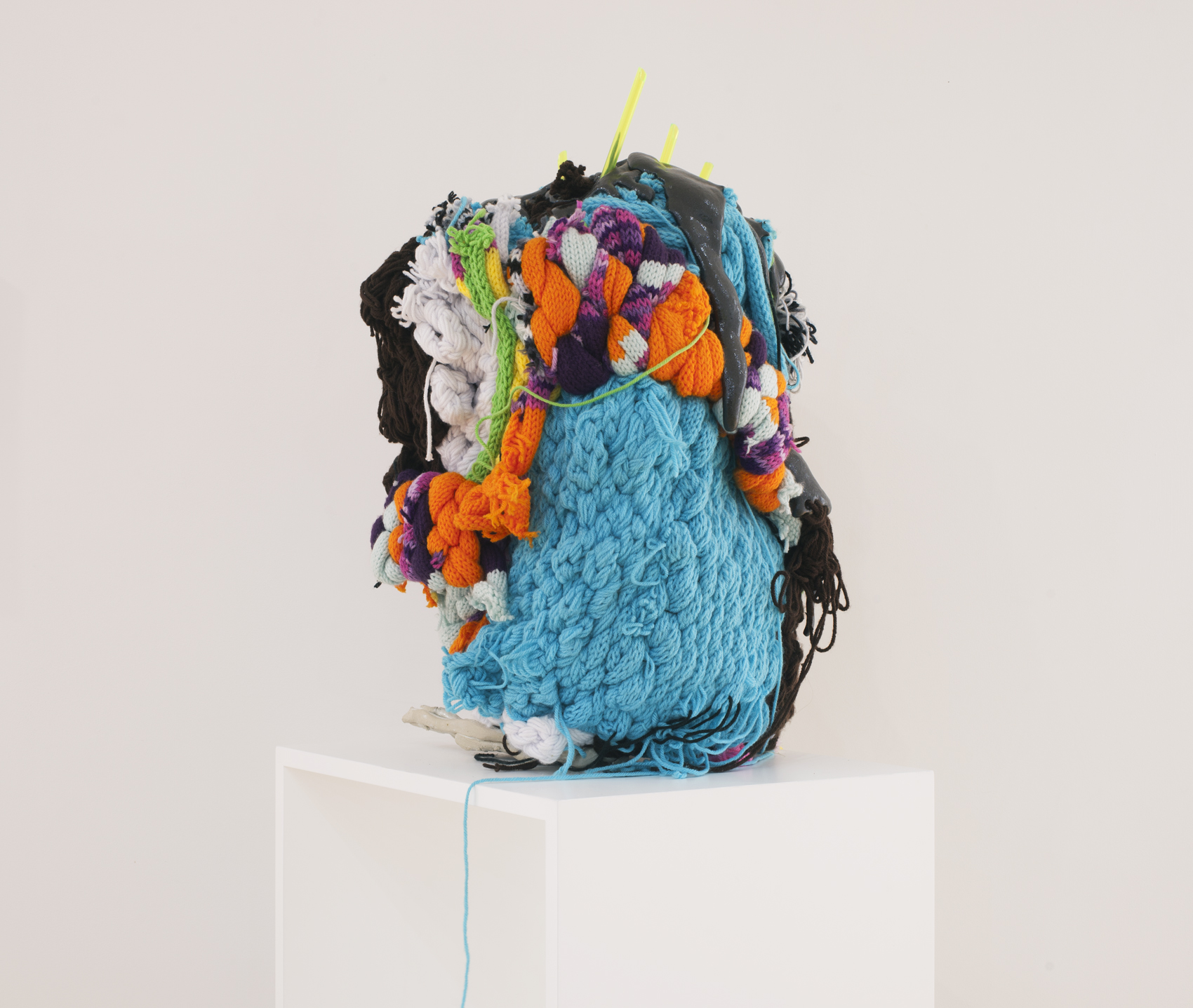 Michael Andrews uses tapestry, knitting and weaving techniques directly in compiling textiles or in the application of their structure in different mediums to in his mixed format works. According to the artist, textile is the halfway point between solid and liquid, in its physical flexibility and elasticity. ‘Sure Lick’ is an aggregation of mixed materials with such variability including thread, felt, and urethane, and the weave structure discovered here also appears in the video animation ‘Weird War’. Flat digital image is distorted partially to twist its space, and certain sections weaved in circulating tube.