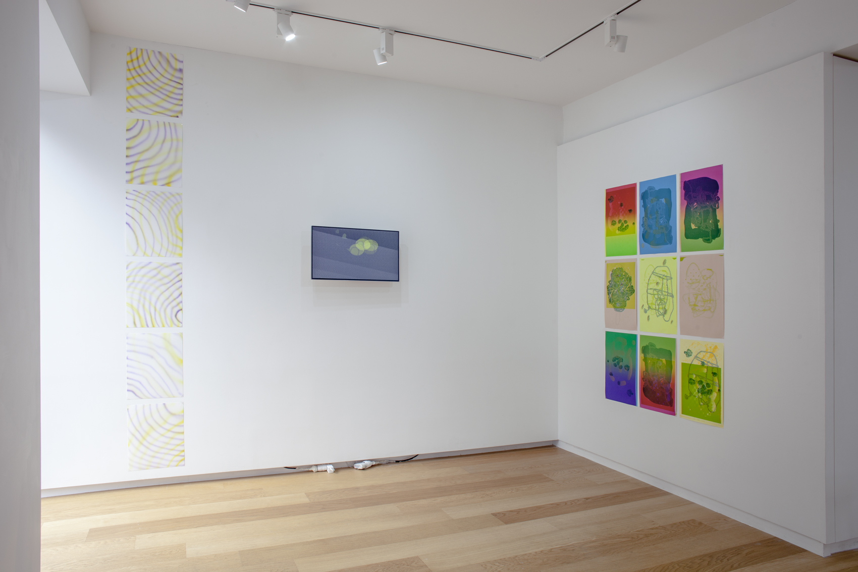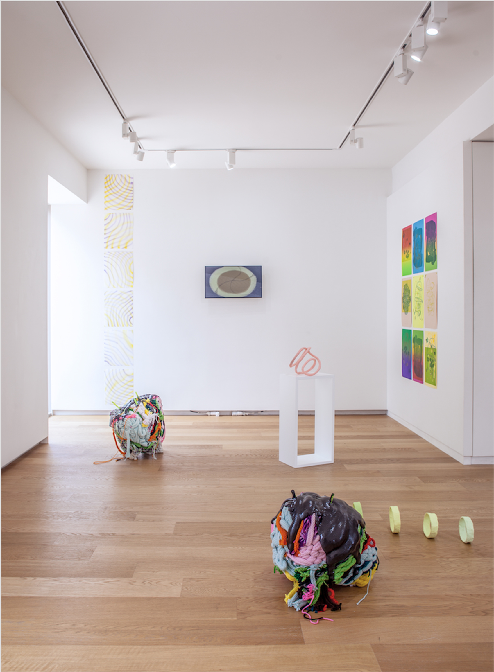 두 작가의 조각을 살펴보면 반복되는 손의 움직임을 상상할 수 있다. 다양한 색실이 수없이 교차하며 울퉁불퉁해진 마이크 앤드류스의 조각은 그물망을, 반복되는 포물선이 확장되는 김태윤의 조각은 물의 파동을 연상케 한다. 작품들이 지닌 상반된 형태와 달리 두 작가가 사용하는 색은 많은 지점에서 하모니를 이룬다. 이러한 색감의 유사성은 두 작가 모두 컴퓨터를 사용한 드로잉과 색 채집을 작업의 기반으로 하기 때문이라 추측된다. 물질과 비물질의 경계에 놓인 여러 매체의 작품들은 마치 컴퓨터로 만들어진 영상들이 출력되어 공간에 자리하는 것과 같은 쾌감을 전달한다.