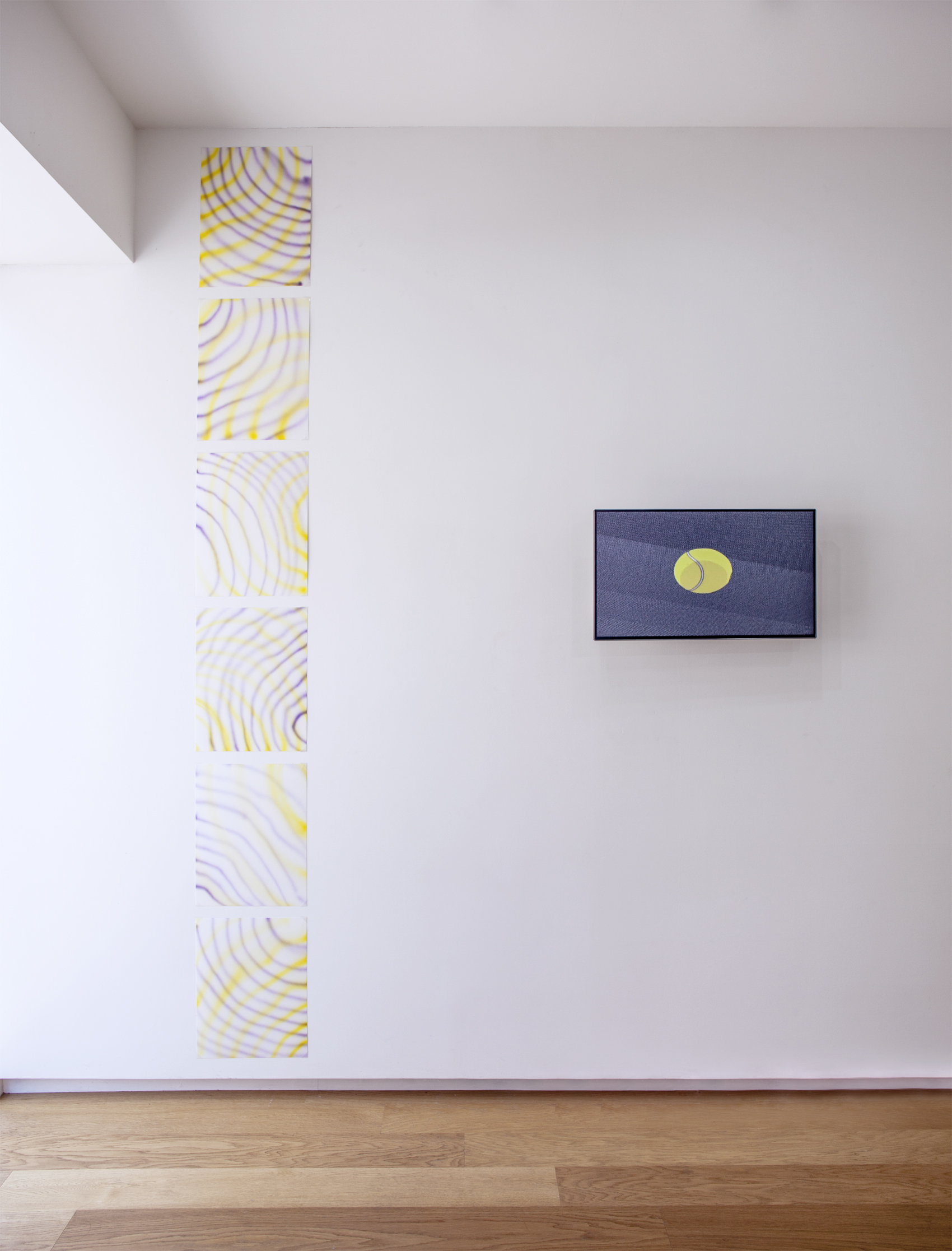 선들을 엮어 순환하거나 반복을 이루는 구조는 김태윤의 작품에서도 지속해서 드러난다. 김태윤은 그동안 자의식을 통해 형성되는 시간의 흐름을 주제로 한 영상들을 선보여 왔다. ‘Ping’ 속 테니스공은 누군가의 강력한 타격을 이기지 못하고 찌그러지거나 튕겨나간다. 이는 일본 애니메이션에서 종종 등장하는 과장된 연출인데 공을 주고받을 때 순간적으로 느끼는 속도와 힘을 가시화 한 것이다. 작가는 이러한 이미지를 차용하여 물체의 모멘텀을 통해 그가 의식하는 물리적인 시간을 구체화하였다. 파동 또는 그래프를 연상시키는 곡선의 조각들 또한 추상적인 시간을 형상화하려는 의도로 보인다.