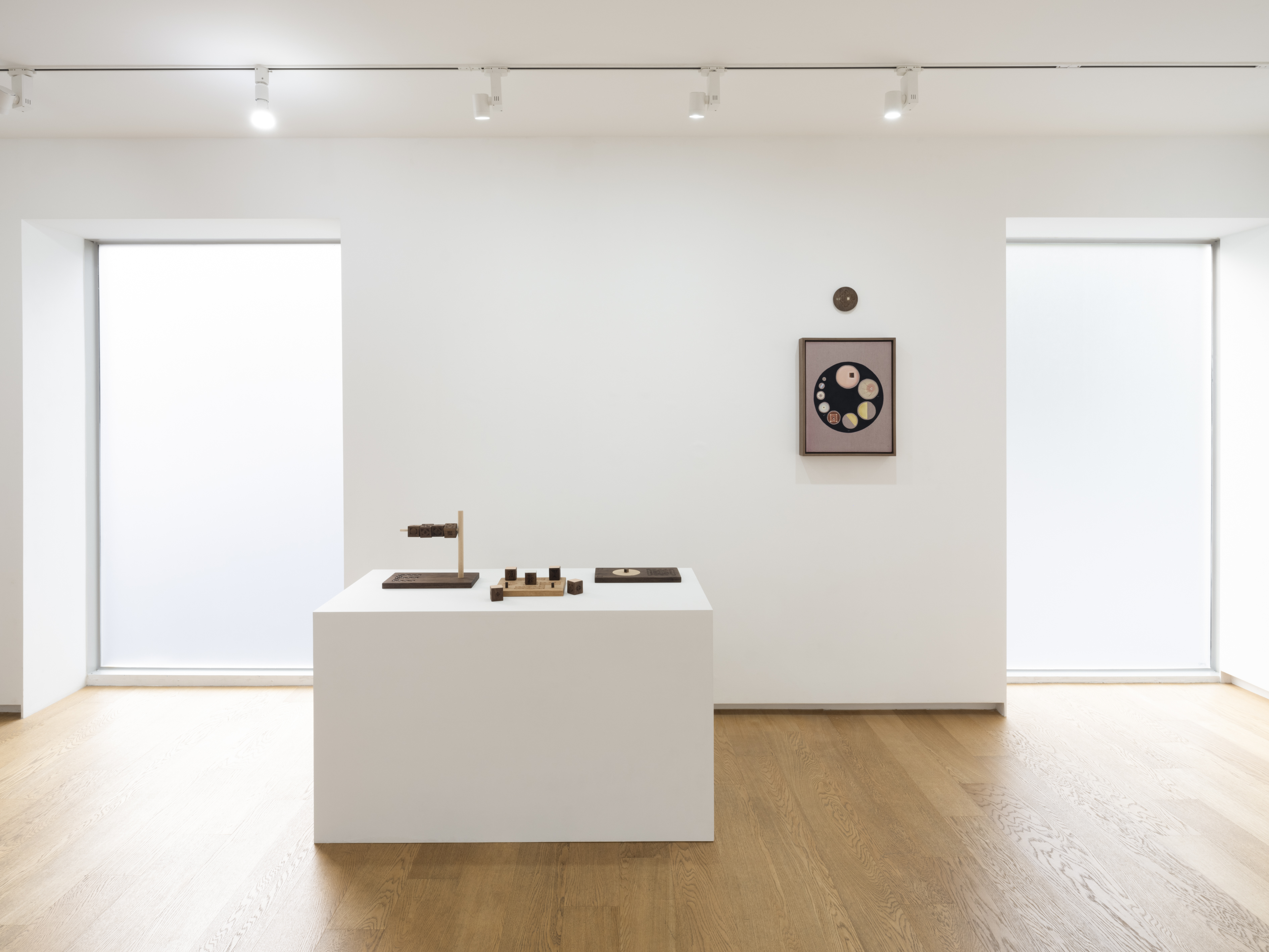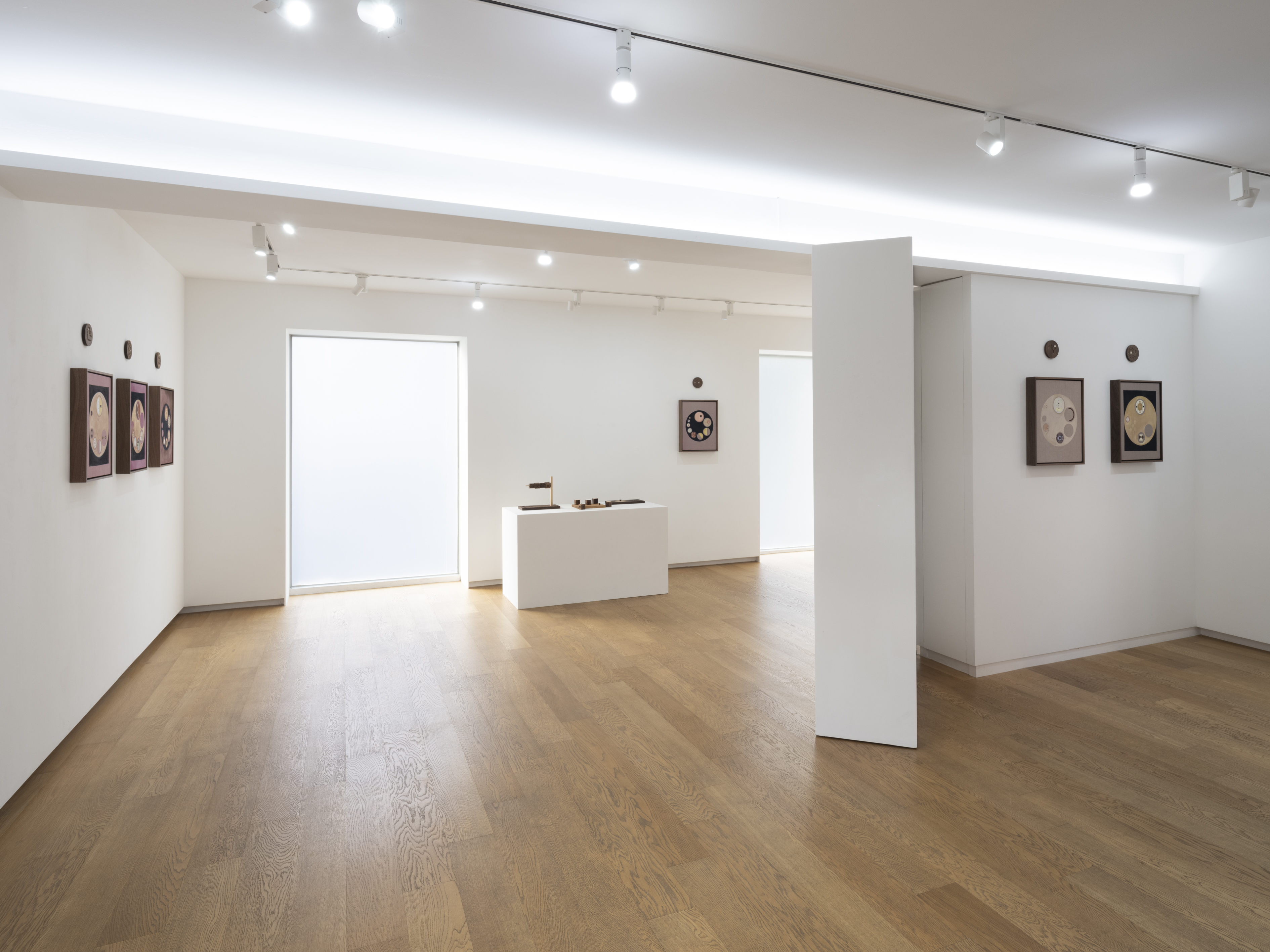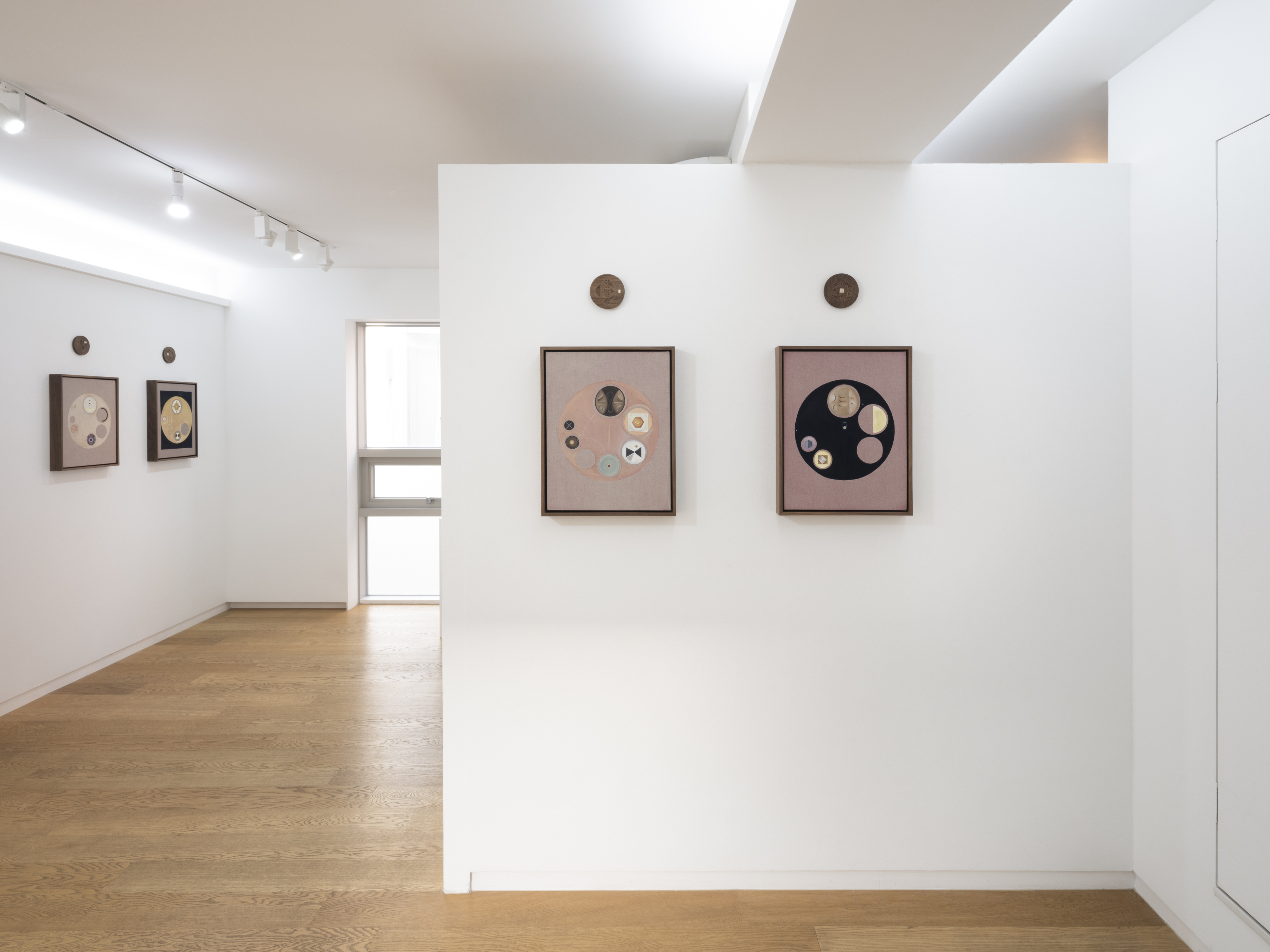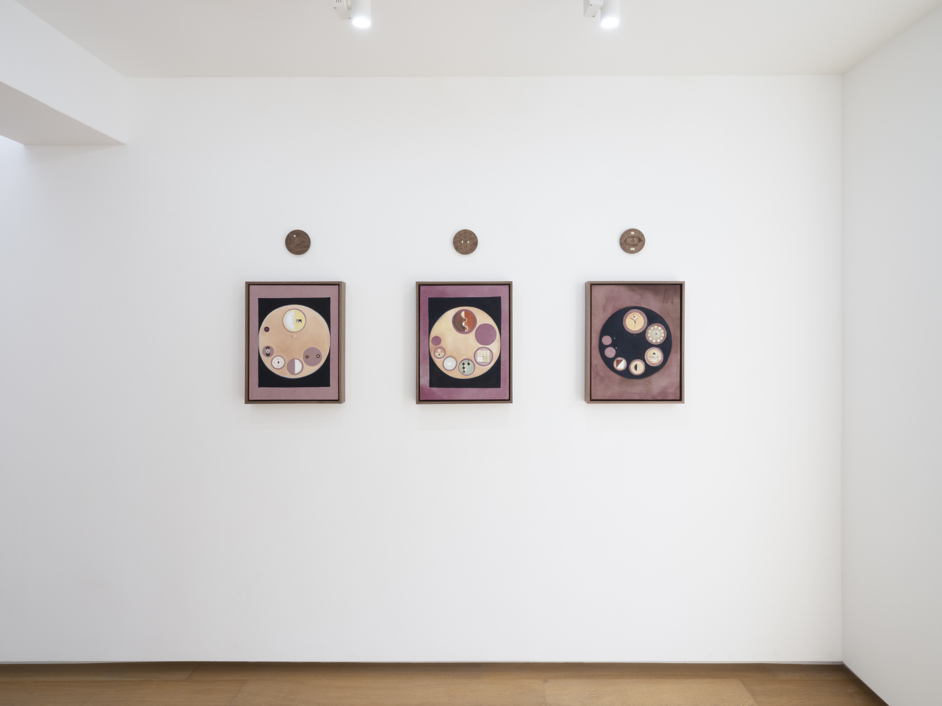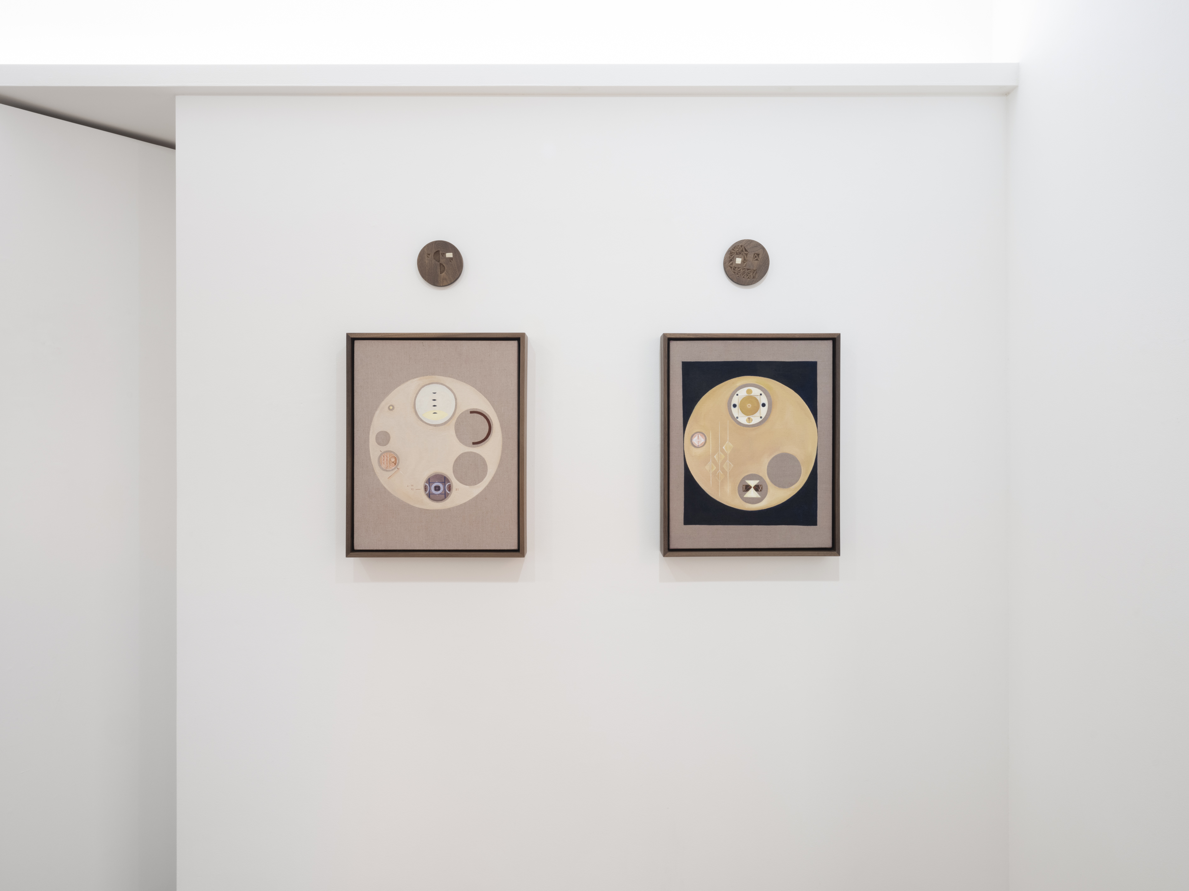 Fernández, who lives and works in Los Angeles, gave birth to her first child in February. During her ten-lunar-month pregnancy, the artist spent most of her time in the Mojave Desert, due to the severe pandemic. While alone in the vastness of nature, she researched and archived materials relevant to the changes she observed in her body. The wheel shape appearing in Visualization for Dilation 1-10 (2021) references an instructional tool on cervical dilation used by midwives. Simultaneously occurring in this series are such phenomena as microchimerism, or the exchange of cells between fetus and mother; diagrams for ocular and tactile stimulation; and the phases of the moon. The red linen used in the paintings is dyed with cochineal¹ collected by the artist. Representing ten months, they are paired with ten round walnut discs engraved with the symbol “x”.