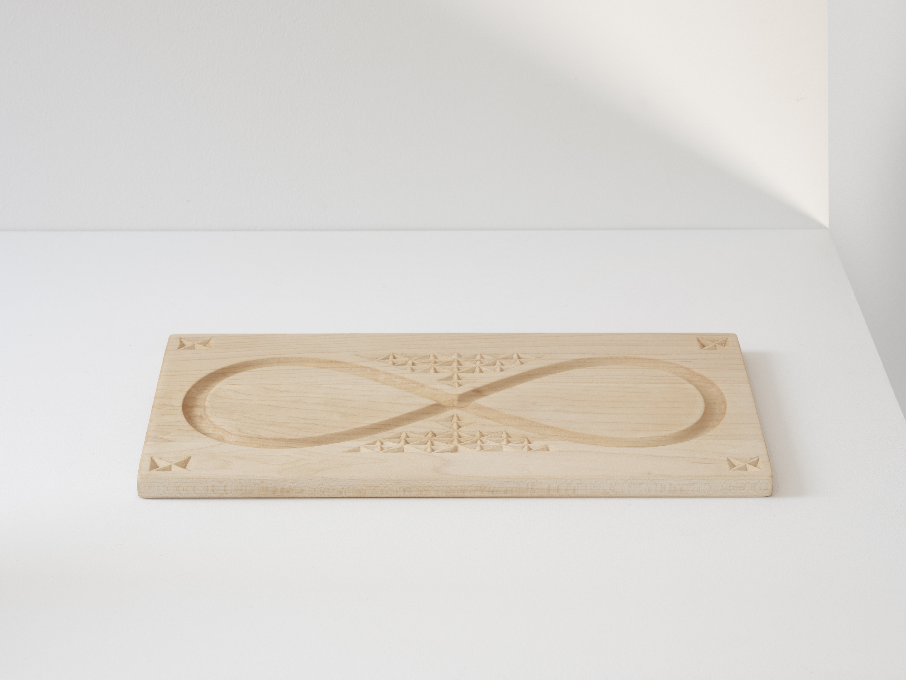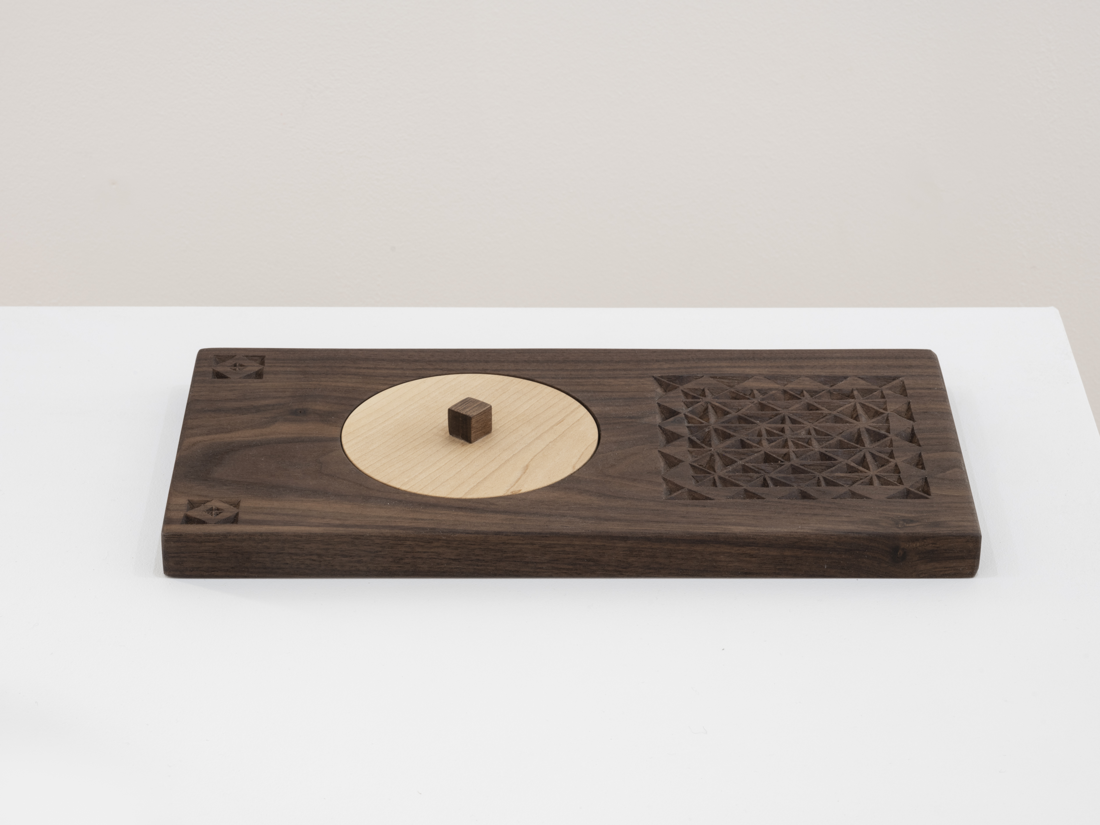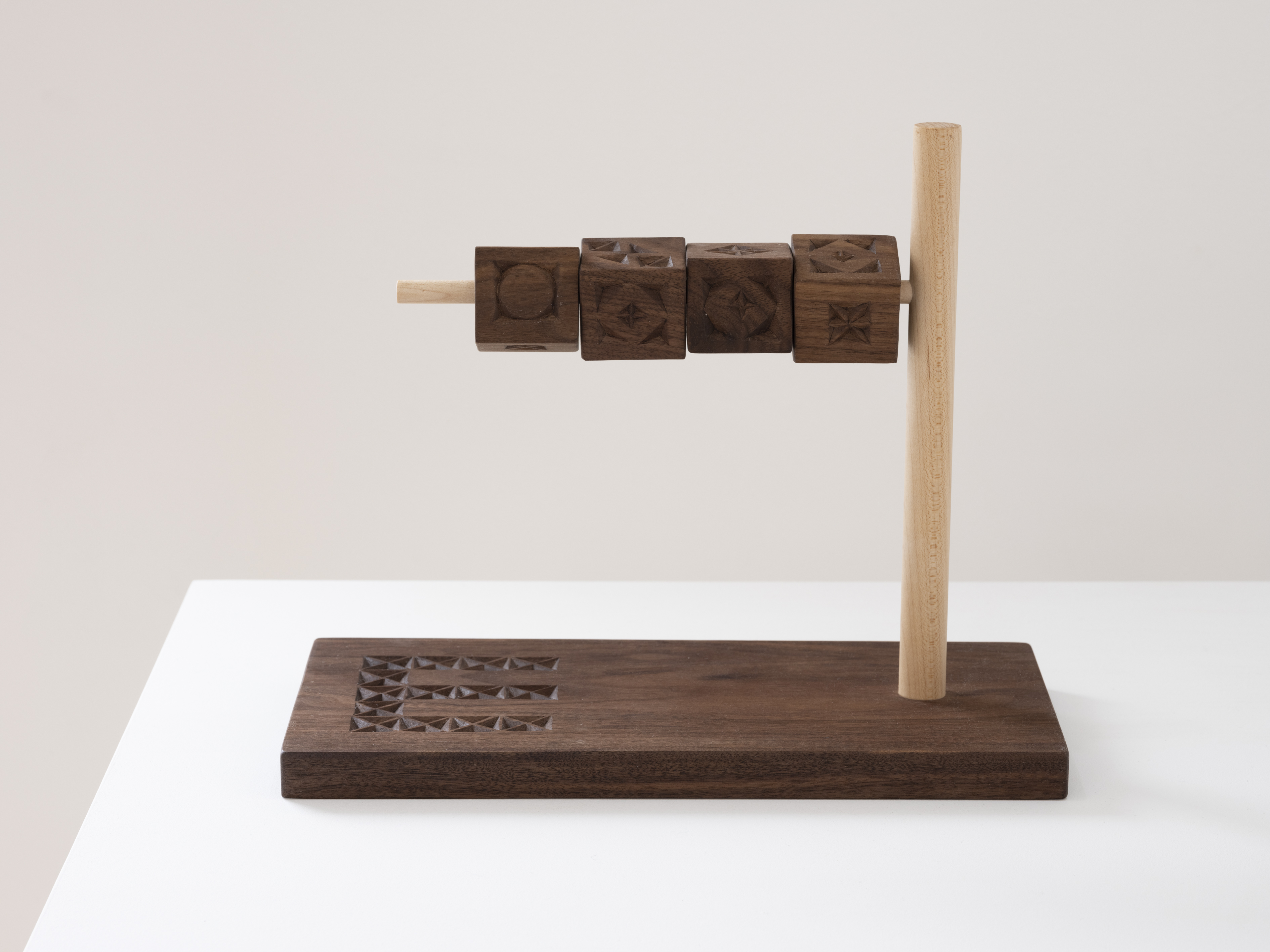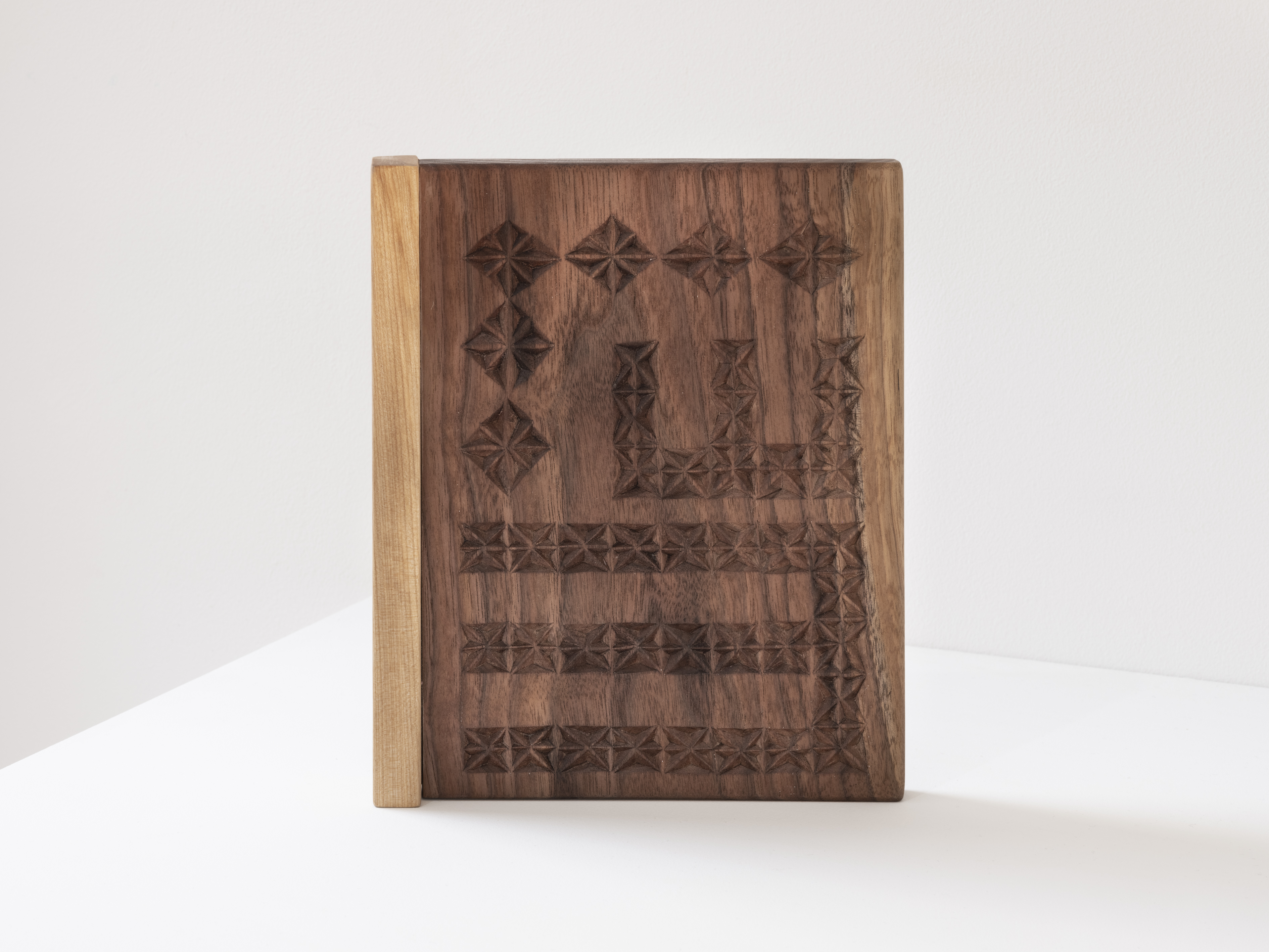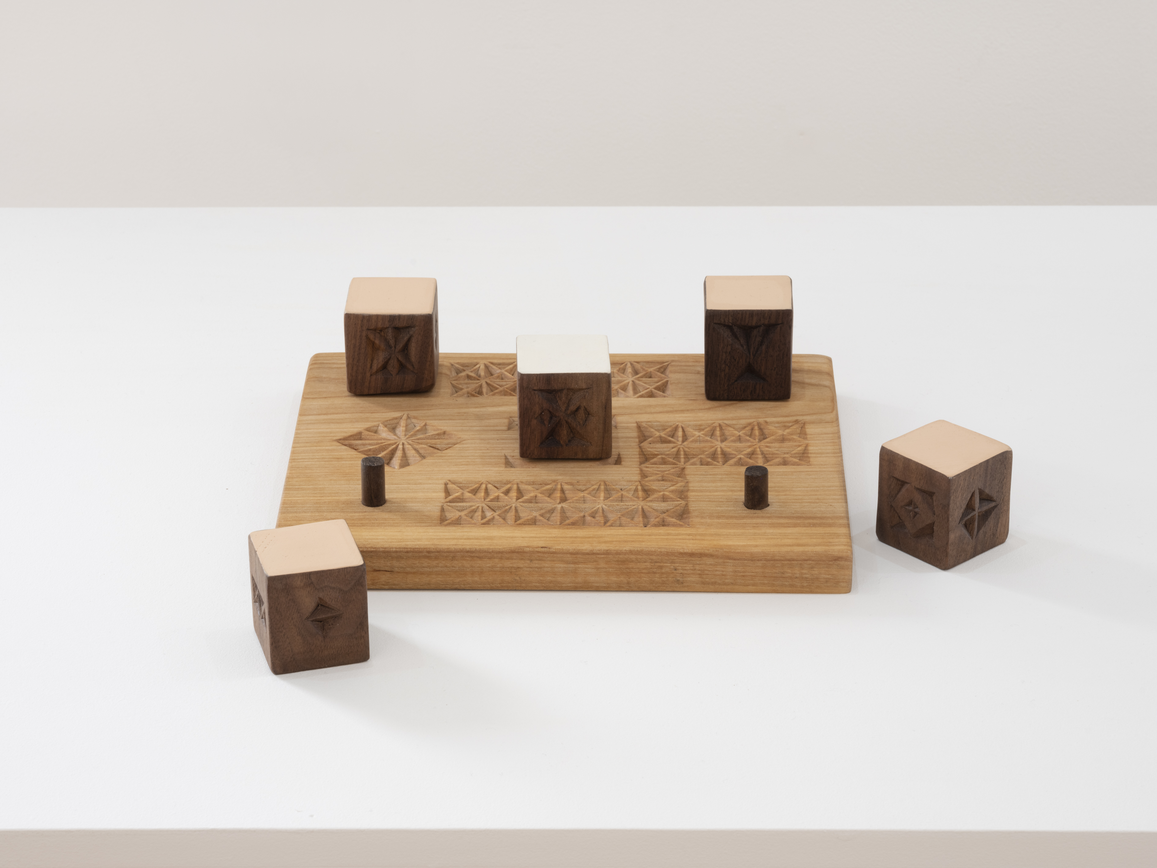 The “x” pattern seen throughout Fernández’s sculptures signifies the connection between generations through the conveyance of history and symbolizes the relationship of the past and the future. This sculptural method is passed on from her grandfather living in Spain, and the project Box (a proposition for ten years) (2012 – 2022)² allows for a closer look into the transmission of knowledge. In Transits, the artist presents five sculptures reminiscent of children’s tactile play toys, as in Horizontal Hand-Eye (2021) and Vertical Hand/Eye (2021). These works visualize a device that reflects perception through touch, such as in the case of her grandfather, who is losing sight as he enters the latter stages of his life.