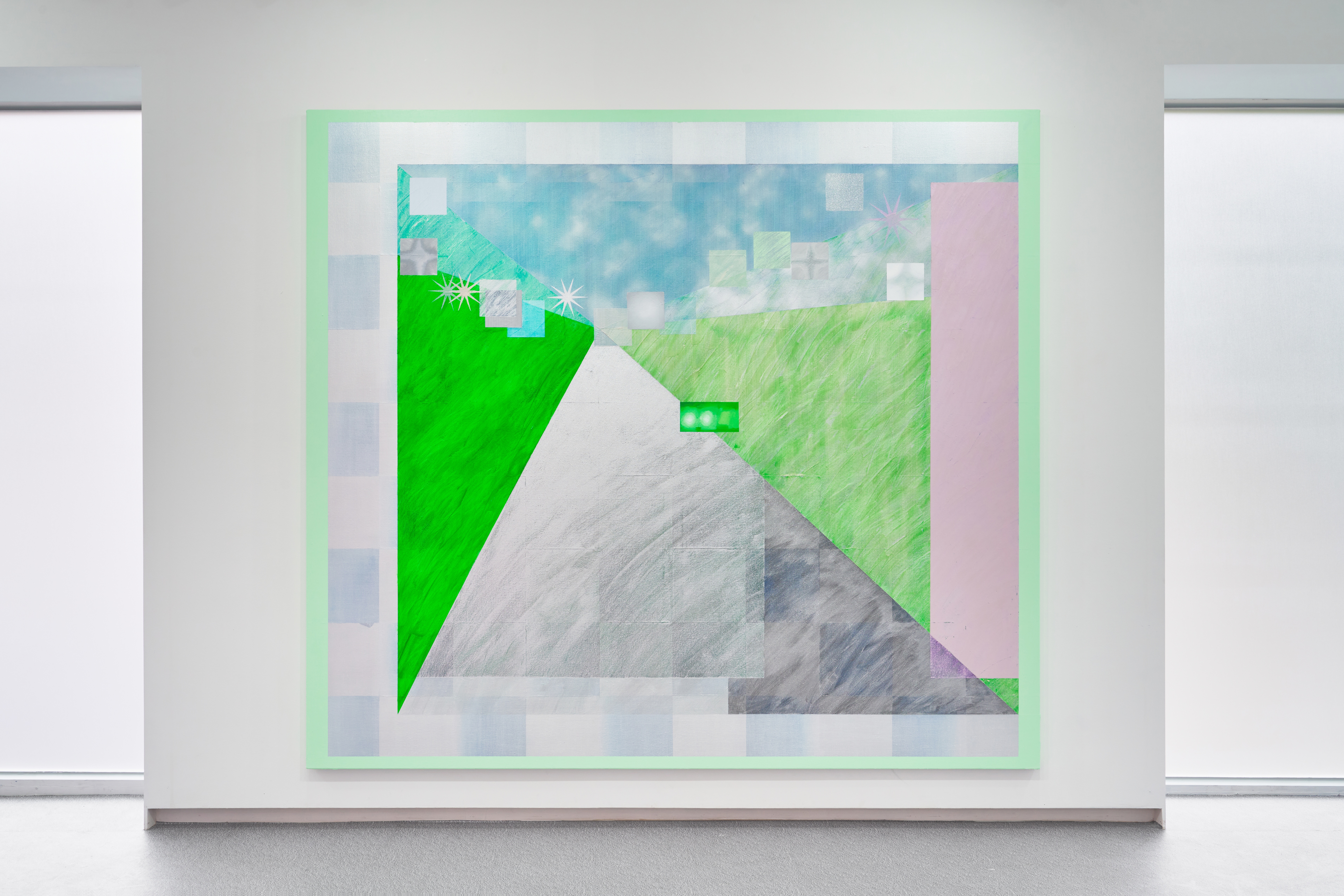 Park’s work is further marked by her use of fluorescent colors and the unique presence of silver. This particular pigment facilitates light as an element of the painting’s experience, in addition to its construction or its study. When combined with the dynamic nature of Park’s brushstrokes, it acts as a new agent. In this manner, the viewer’s experience with the work is in constant change, according to location, time, and perspective. Illumination is captured internally within the frame, and triggered externally within the viewer during their encounter.